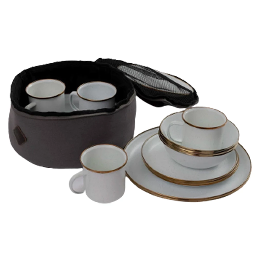 - Store place setting for four of Barebones enamel dinnerware (4 deep plates, 4 salad plates, 4 bowls, and 4 enamel cups) without dividers