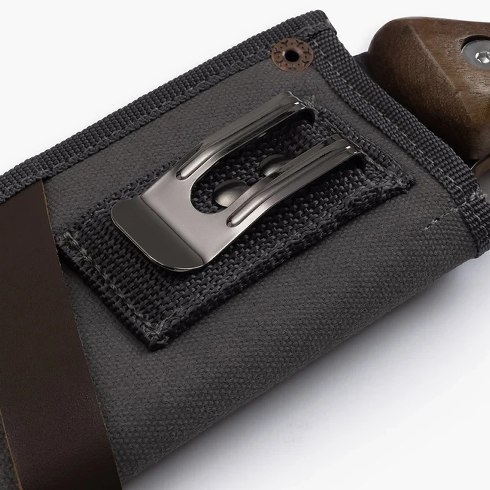 Included 900D polyester sheath weathers real-world use while protecting the blade from dulling. Stainless steel belt clip supports easy carrying and accessibility, while the strong handle strap restricts the blade from slipping or moving. Accented with full-grain leather and copper to complement the rest of the Woodsman Collection.