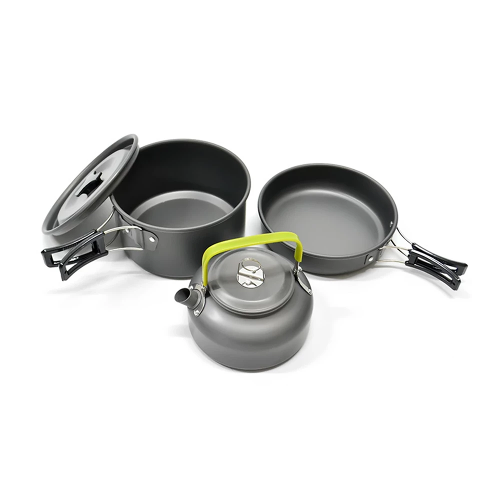 1x big pot, 1x big lid, 1x small tea pot, 1x frying pan, 1x folding spoon, 1x turner, 1x cleaning cloth, 3x bowl, 1x bag