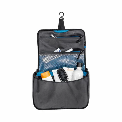 Generously sized, stand-up toiletry kit with spacious organization and a hook for easy hanging.