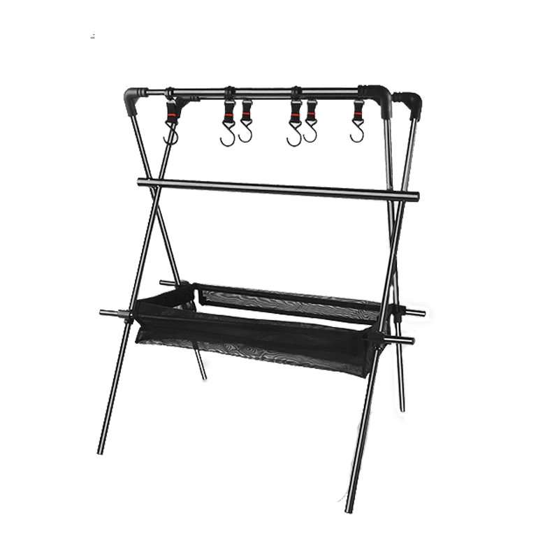 Nice hanging rack for kinds of outdoor pot, pan, camping light, tools and clothes. It built-in elastic cord, easy and convenient to set up, fold and storage. Come with movable hooks, convenient for kinds of cookware and easy take down for storage.