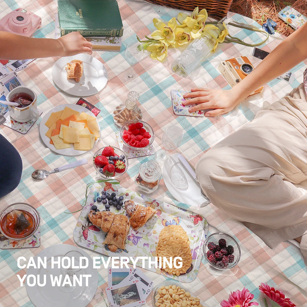 ETROL picnic mat is composed of 3 layers of materials. Bottom: Made of 210D waterproof Oxford cloth, sand-proof, waterproof, moisture-proof and scratch-proof, suitable for various environments. Middle: Filled with Thicken polyester filling, soft and elastic, with heat insulation and flame retardant functions. Top: The material used is 75Dx150D Pongee, which is friendly to the skin, feels smooth and does not wrinkle.