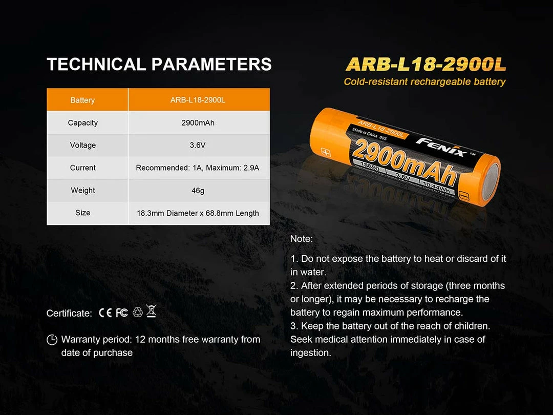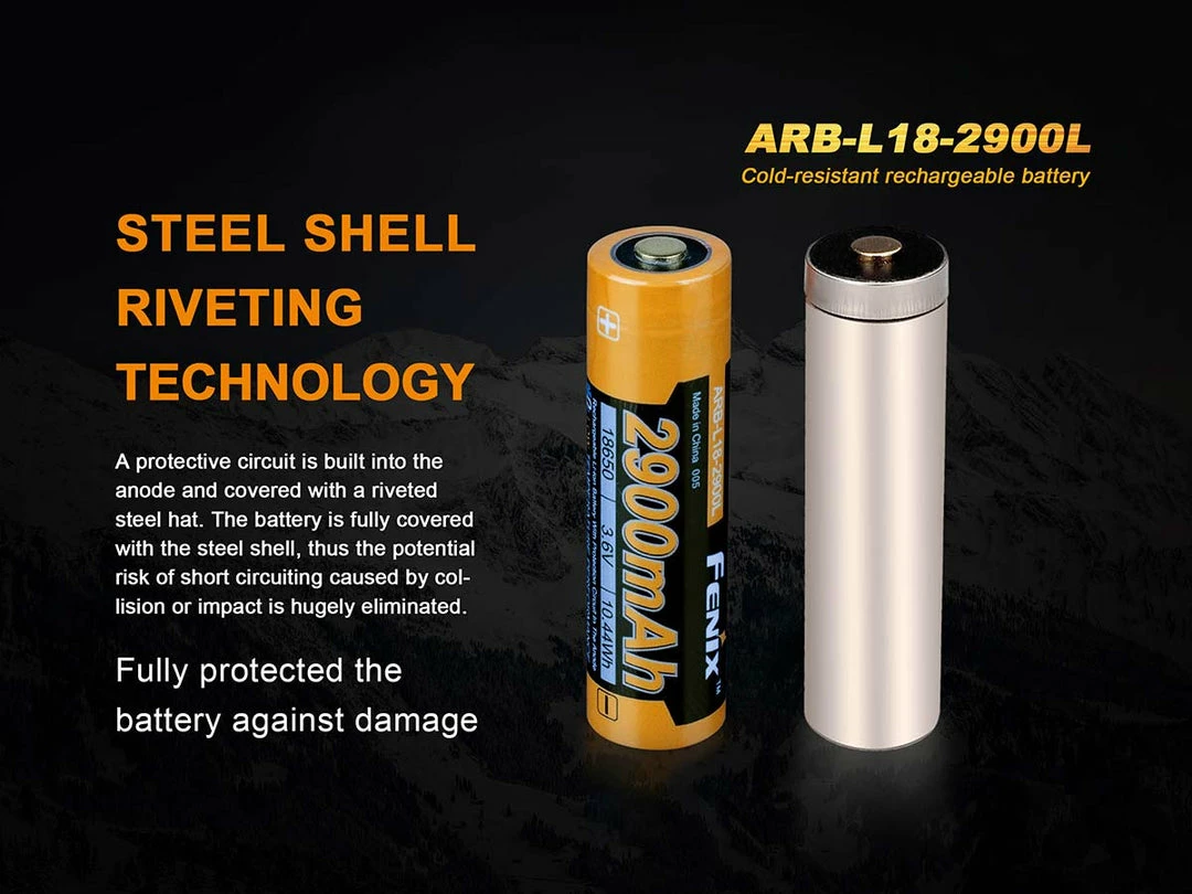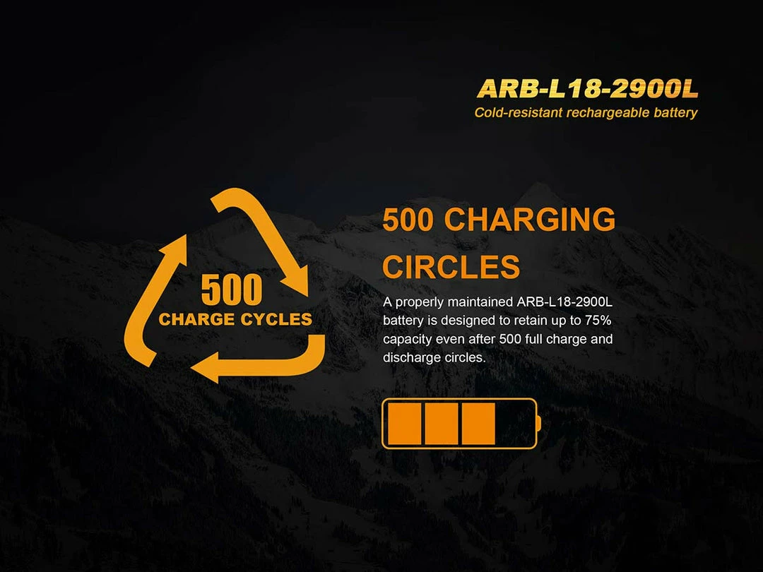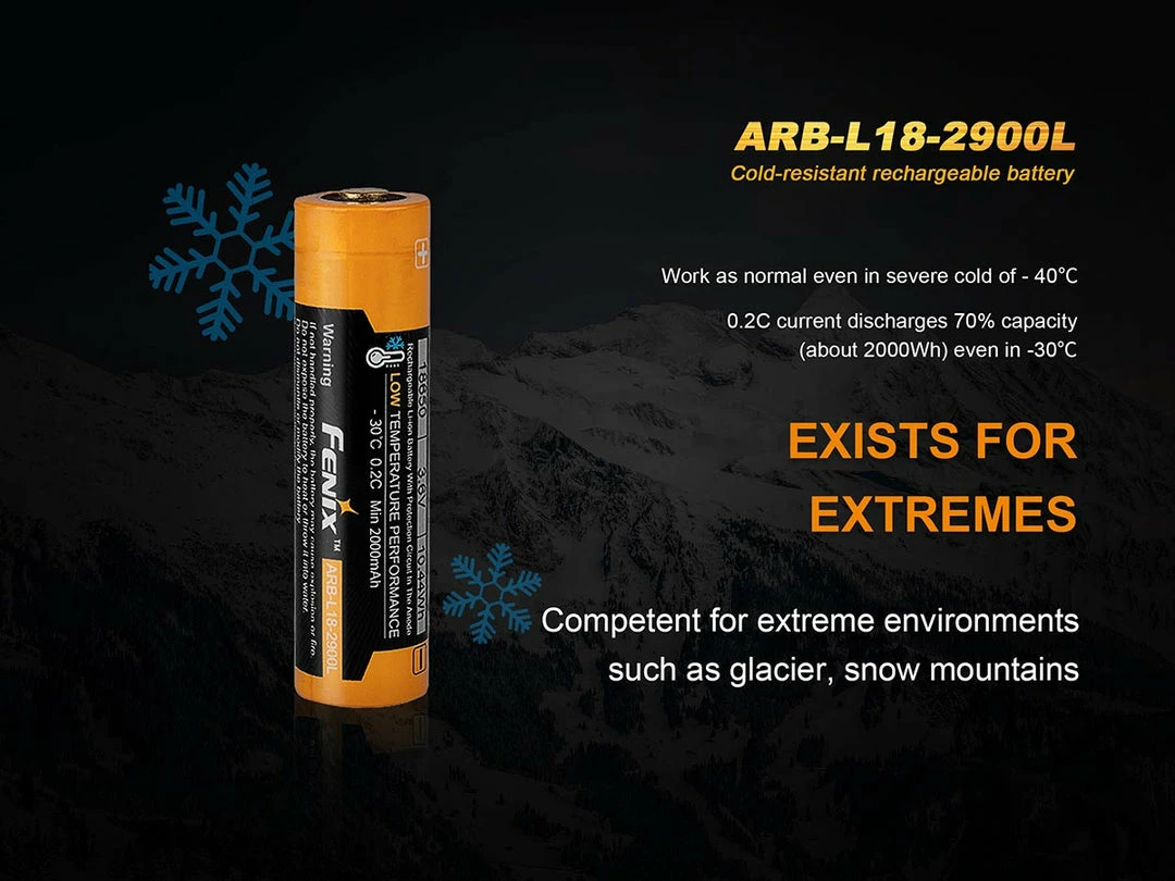 ARB-L18-2900L is a high capacity 18650 Li-ion rechargeable battery built specifically to withstand extreme cold temperatures—as low as -40°C/-40°F. Additional features include a protection circuit in the anode to help prevent short circuits, over charge/discharge and over heating. Pressure relief vents which expel waste gas in the rare case of an internal short circuit preventing an explosion. Battery capacity up to 2900mAh, maximum output current 4A. 500 charging cycles.