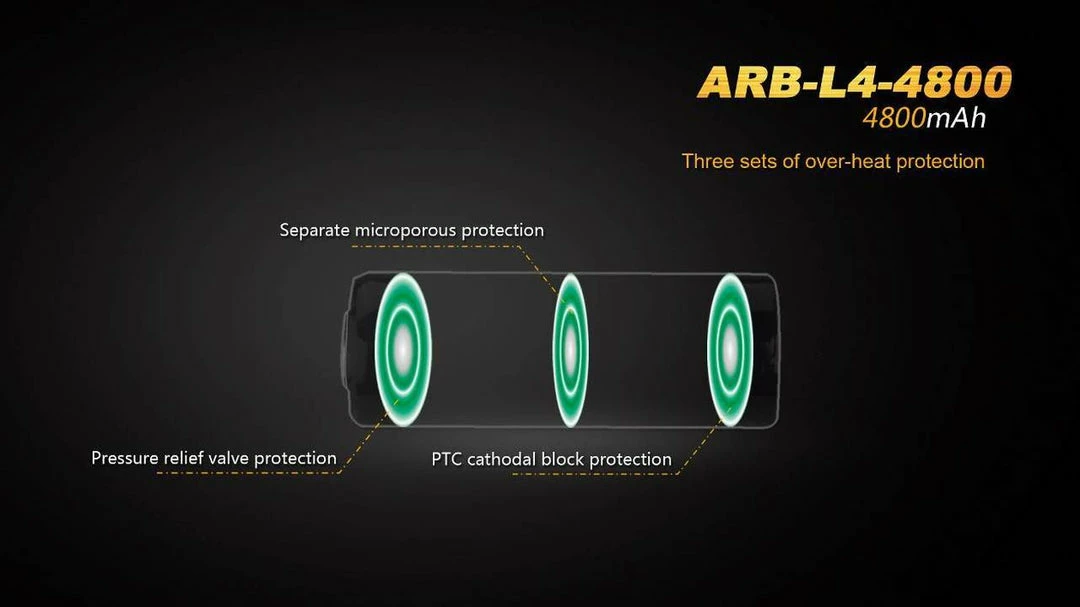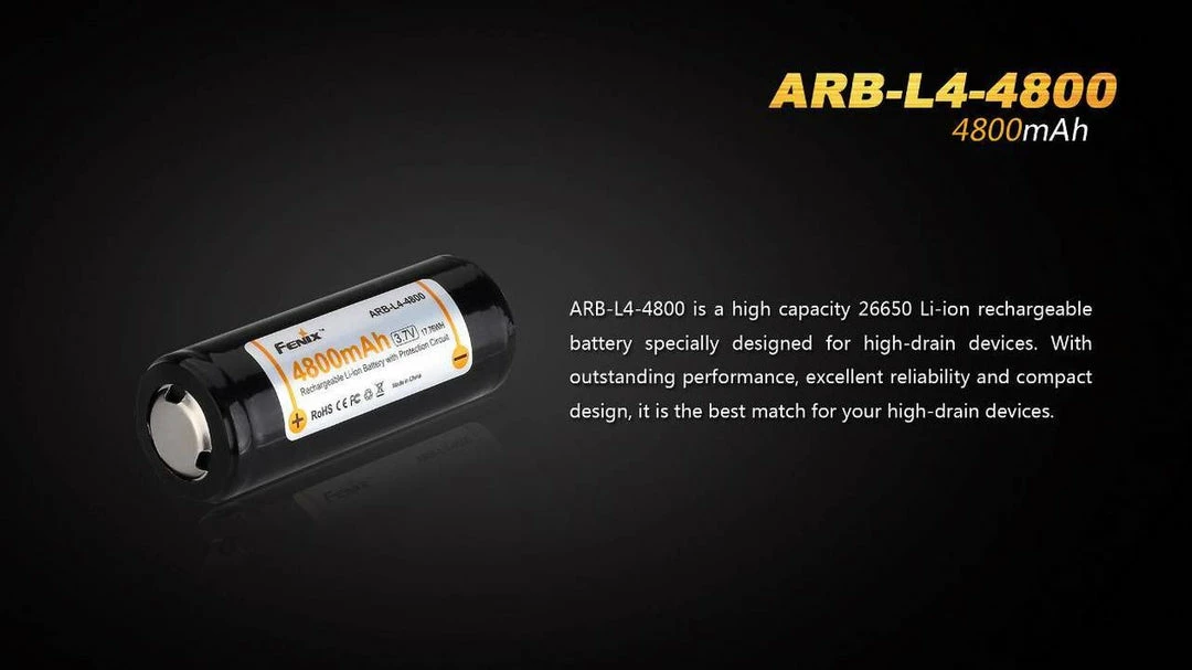 Introducing Fenix’s new battery source product line. The ARB-L4-4800 is a high-capacity 26650 Li-ion rechargeable battery specially designed for high-drain devices. With outstanding performance, excellent reliability, and compact design, it is the best match for your high-drain devices.
