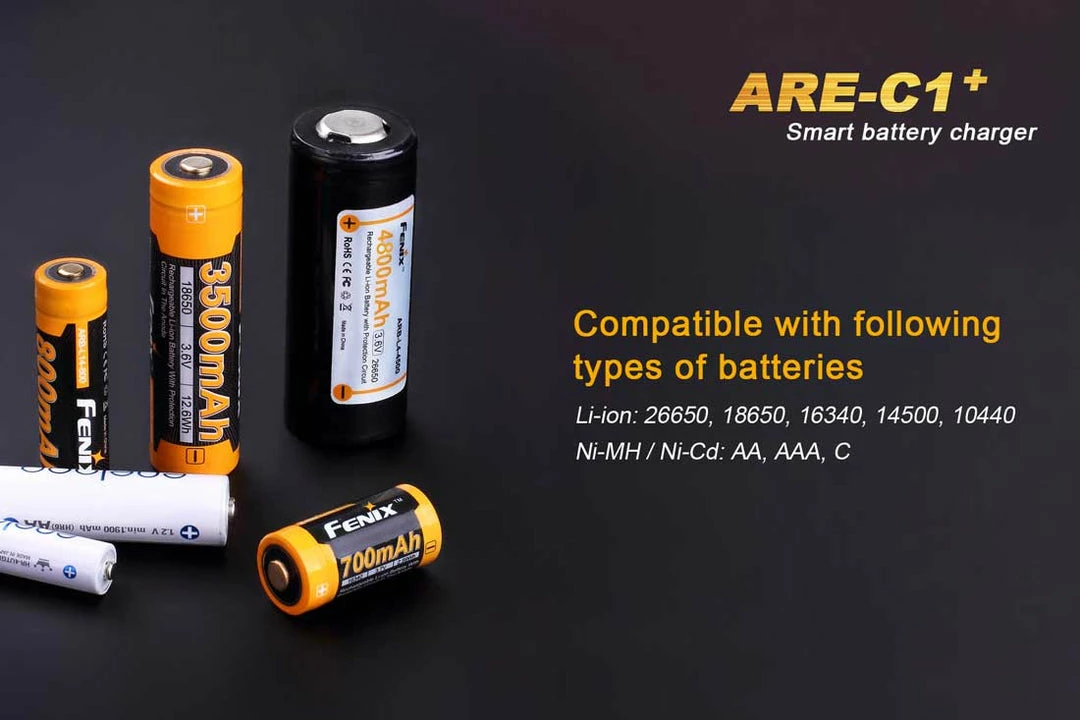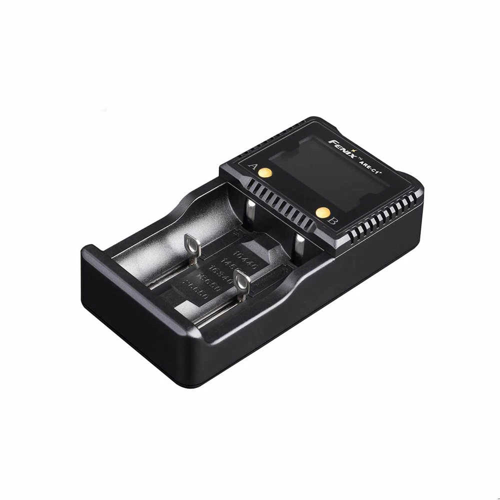 The Fenix ARE-C1+ is dual-channel smart charger, built for different types, and different size, rechargeable batteries. The charger will automatically choose the correct charging mode for each battery type, whether it be Li-ion, Ni-MH or Ni-Cd. The high-definition LCD screen displays charging status and battery levels. In addition, the ARE-C1+ includes a car charging mode which allows you to charge in your car (car adapter not included).