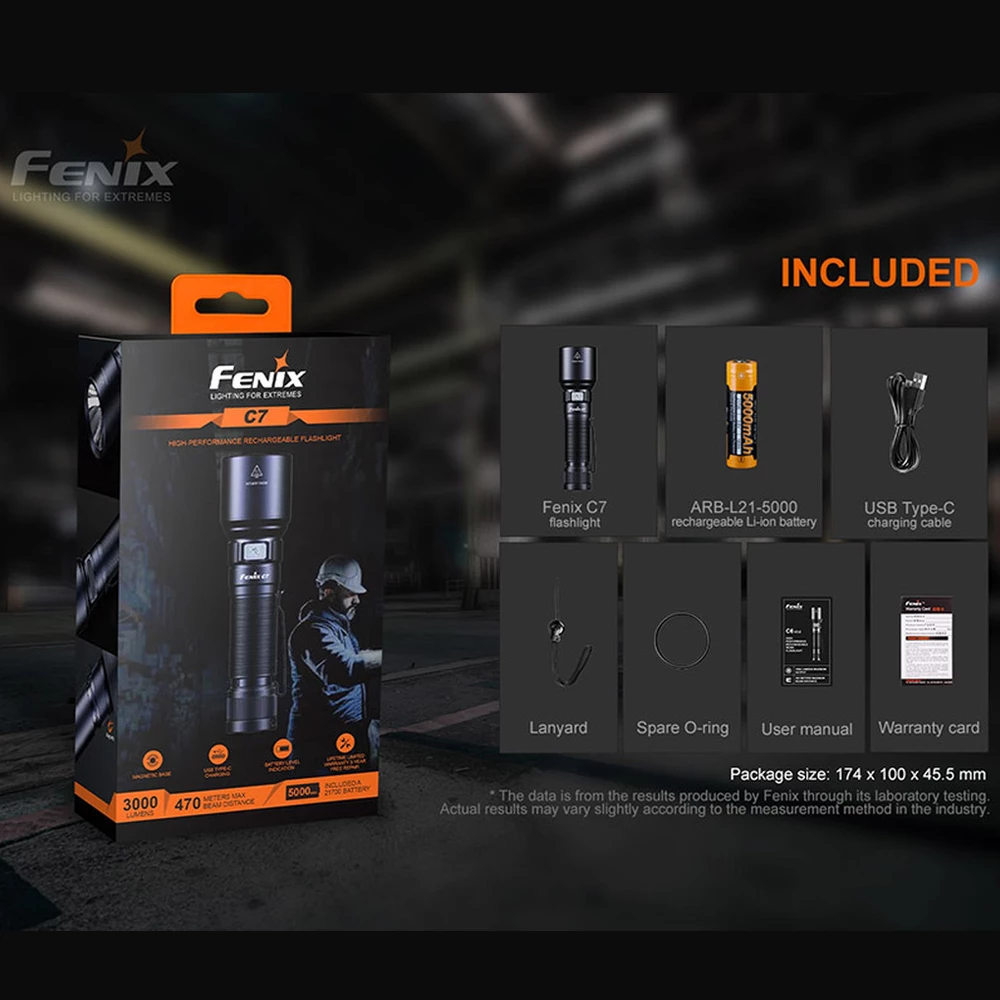 - What’s in the box: 1 x Fenix C7 Luminus SST70 Cool White LED Flashlight including battery