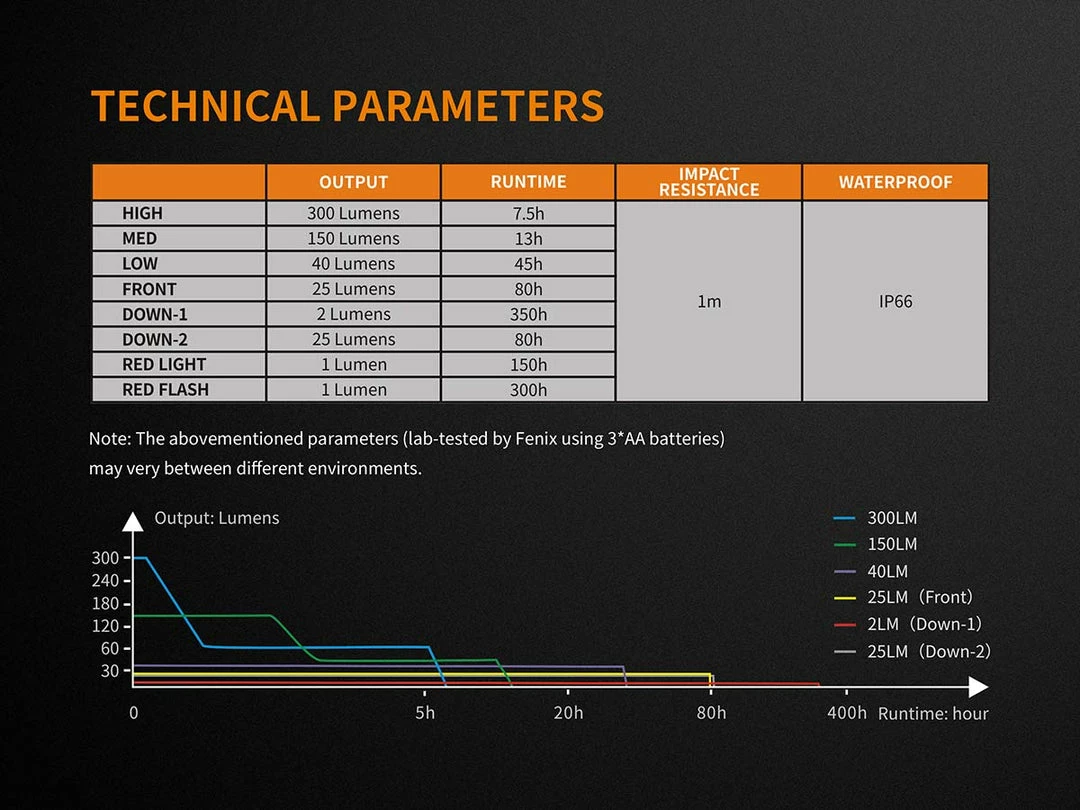 - Note: The abovementioned parameters (lab-tested by Fenix using three AA alkaline batteries) may vary between different environments.
