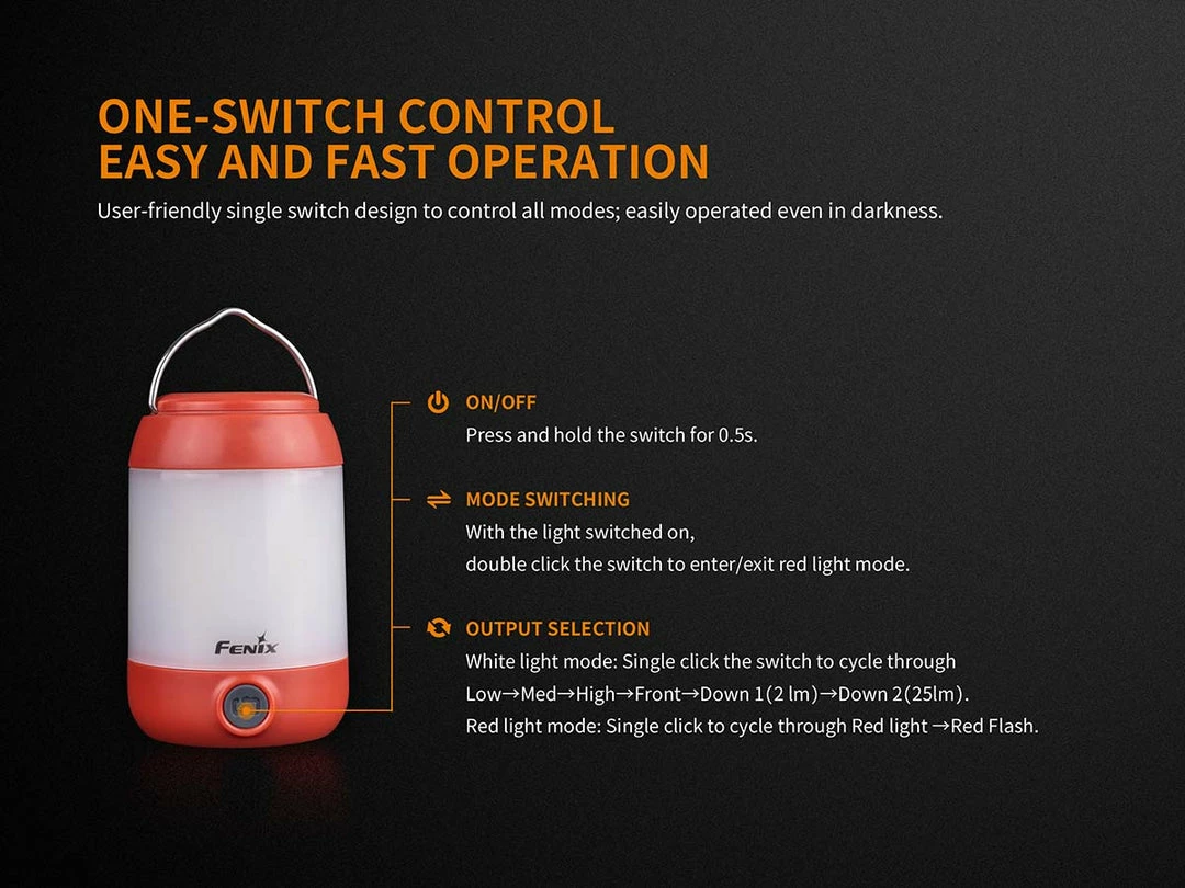 The Fenix CL23 Lantern is a multi-directional, lightweight camping lantern. Powered by AA batteries this lantern delivers a max output of 300 lumens—plenty of light to illuminate your entire campsite. A unique feature of the lantern is the multi-directional lighting modes—three brightness levels of 360° light, a front light and two brightness levels of down light. Don’t have enough batteries? Power the CL23 with only one or two batteries in an emergency situation. Durable and rain-resistant this lantern a perfect camp companion.