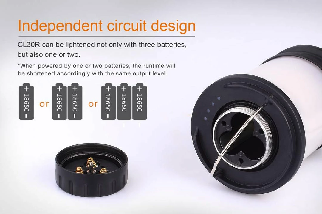 - Powered by one, two or three 18650 rechargeable Li-ion batteries