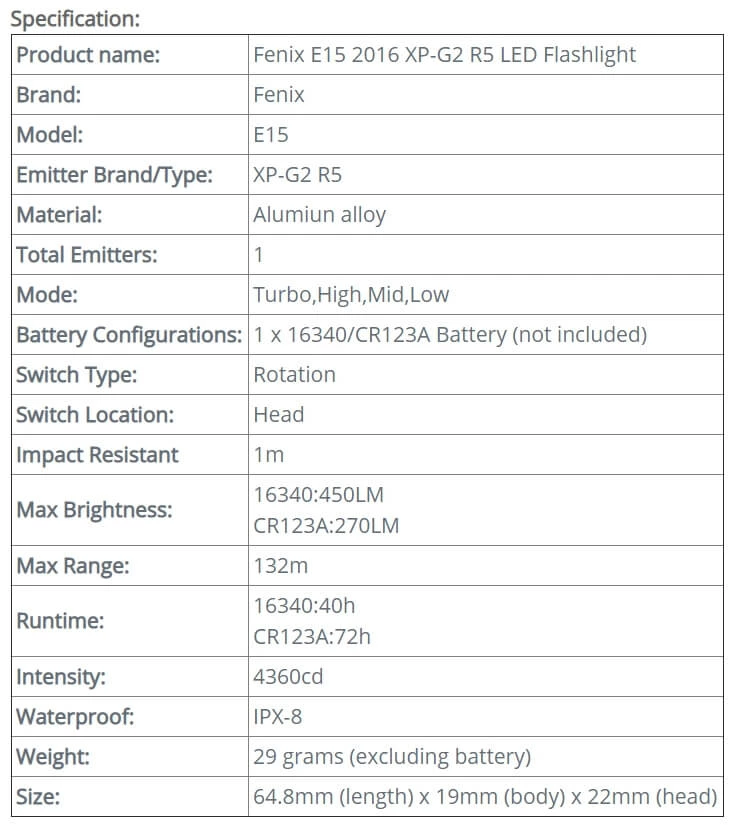 If you’re carrying around a flashlight, it better be able to take some rough handling. The E15 is packed with features that will keep it safe from bumps, drops, splashes or whatever comes its way. The light is made of lightweight aerospace grade aluminum that has further been hard anodized to resist corrosion or scratches.