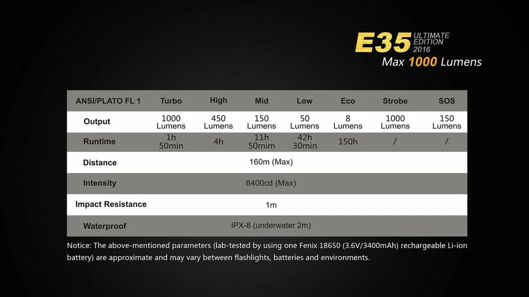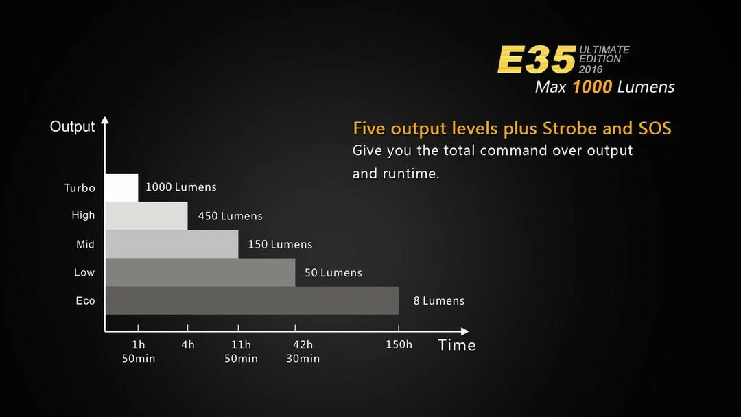 The 2016 Edition of the Fenix E35UE packs a big punch. Only measuring 4.8 inches and 1000 Lumens, this light will quickly be on your favorite flashlight list. Designed with an easy to use dual side switch, the E35UE will be easy to use in any situation. With it’s compact size and easy functionality, it would be hard not to use this light daily. The E35UE will fit in any space making it one of the best Everyday Carry Flashlights around. It can be powered by either a single 18650 battery or two CR123’s.