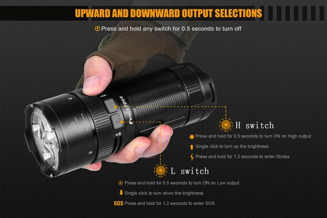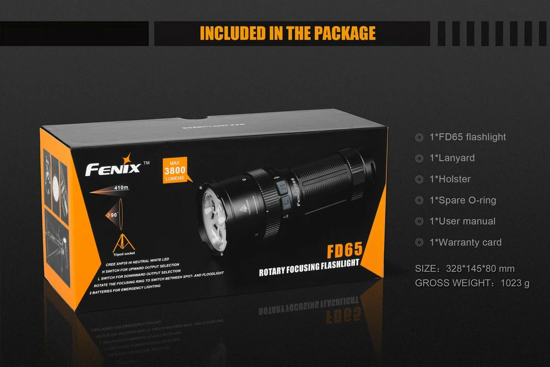 The Fenix FD65 Focus Flashlight is a beast of a light in fairly compact form. Its neutral white LEDs and high-efficient TIR optical lens allow this flashlight to blast 3800 lumens of light one-quarter of a mile when focused to a tighter 10° spotlight. For a wider beam, simply twist the flashlight’s head to transition to a 90° floodlight (for greater close-in visibility). The simple operation of switching through its 5 light levels and 2 strobe modes are done by its highly functional side switches that are built into the compact 6? long and 2? diameter body. Waterproof/dustproof design continues the long list of attributes that make this the ultimate tool for search/rescue, security and professional applications.