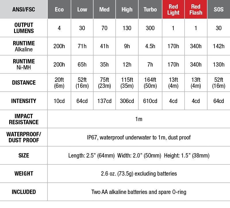 The upgraded Fenix HL30 2018 Edition headlamp features a wide-range flood light that fills your field of view with a maximum 300 lumens at a distance of 164 feet (50 meters). Dual switches operate the HL30 headlamp’s eight lighting modes including five brightness levels, red reading light, red flash and SOS. IP67 rated waterproof and dust proof, sweat channeling reflective headband and powered by readily-available AA batteries round out this lights features. The HL30 will soon be your go-to headlamp anywhere hands-free lighting is needed.