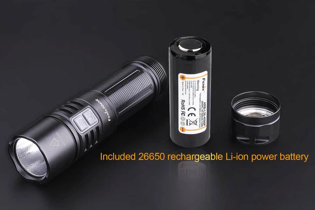- Batteries: One 26650 rechargeable Li-ion battery (included)