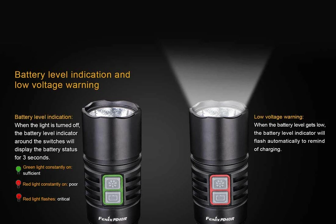 The Fenix PD40R USB rechargeable flashlight is powered by an 26650 Li-ion battery (included) that produces a maximum 3000 lumens when in Turbo mode. Gain extended runtimes while utilizing any of the other 4 lighting modes and 2 strobes. Seven lighting modes are easily accessed via the dual side switches and battery level is indicated by a color ring on these switches. Other features include digitally regulated output and IP68 waterproof/dustproof classification.