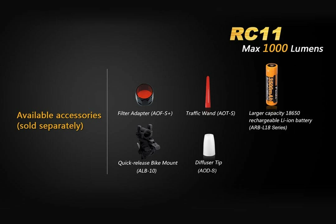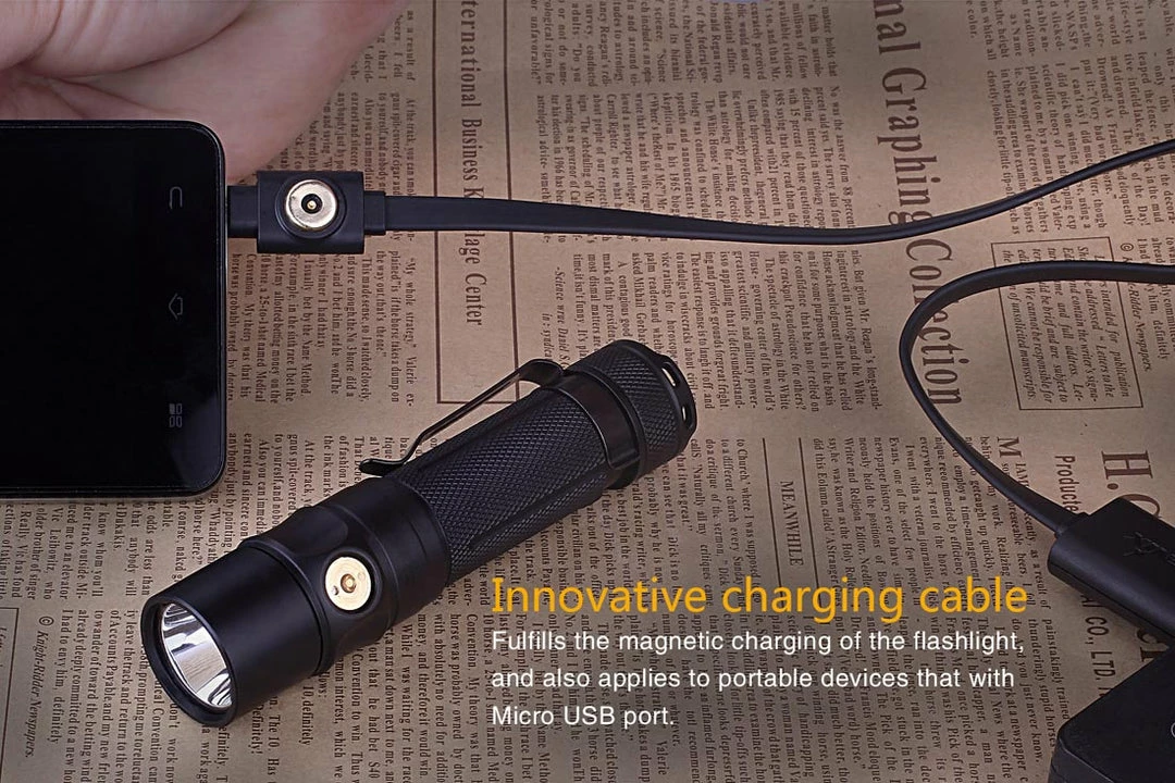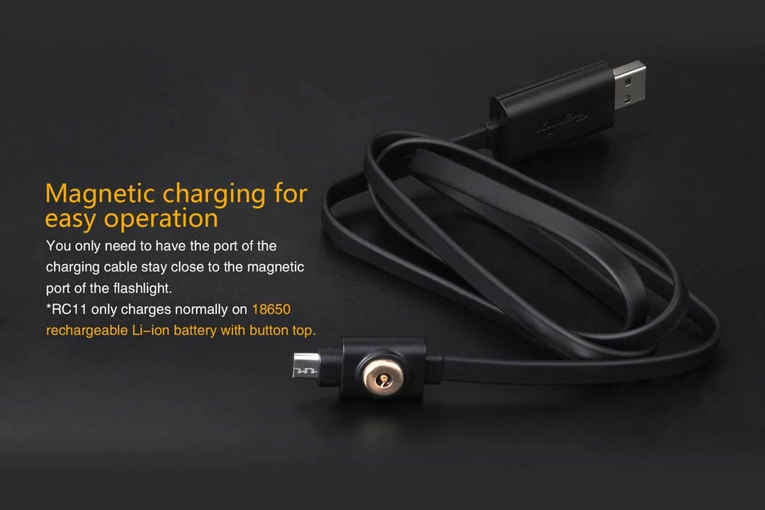 Measuring at only 4.5 inches in length, the Fenix RC11 rechargeable flashlight delivers max 1000 lumen output and a runtime up to 135 hours. Equipped with innovative dual-purpose charging cable, the RC11 flashlight has a magnetic charging port and Micro USB charging port. Cycle through 6 modes all powered by the included 18650 Li-ion battery. Also the flat tail cap offers convenient tail stand capability for using as an upward-facing spotlight.