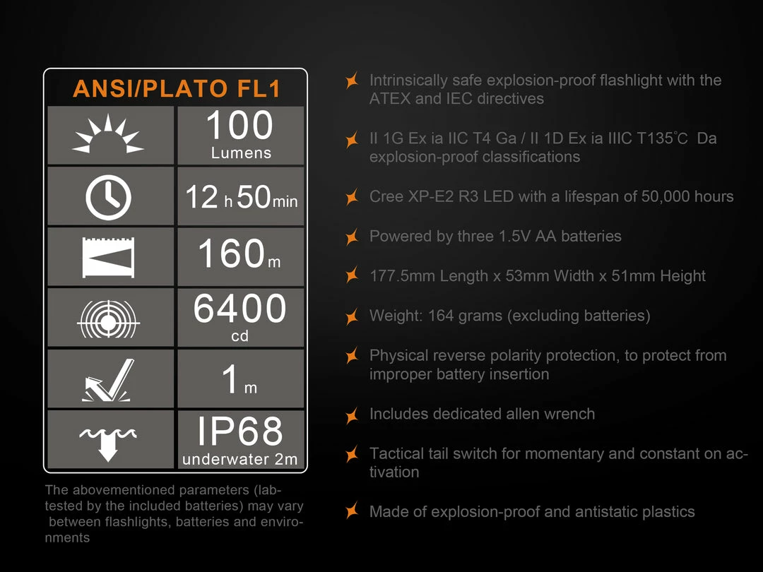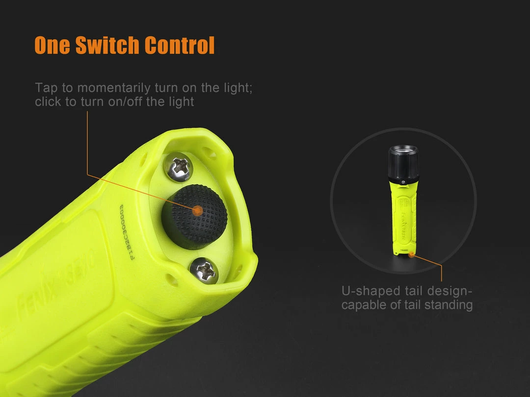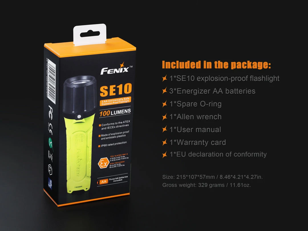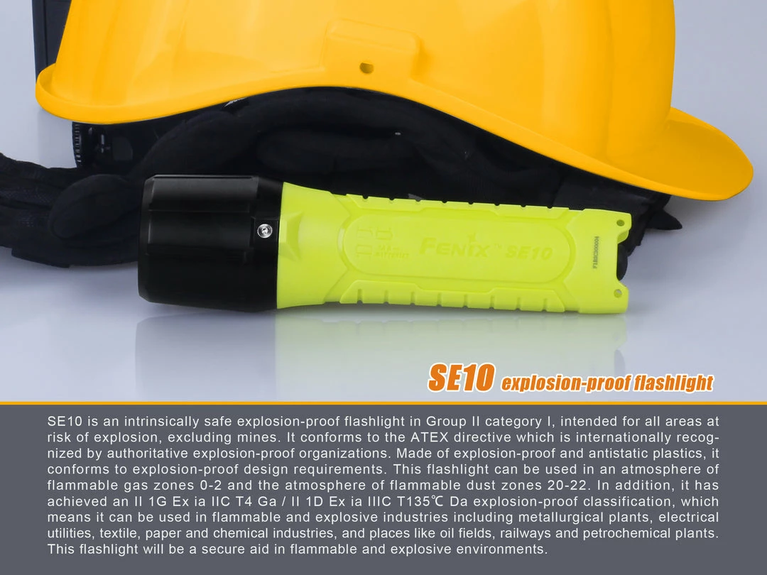 SE10 is an intrinsically safe explosion-proof flashlight in Group II category I, intended for all areas at risk of explosion, excluding mines. It conforms to the ATEX directive which is internationally recognized by authoritative explosion-proof organizations. Made of explosion-proof and antistatic plastics, it conforms to explosion-proof design requirements. This flashlight can be used in an atmosphere of flammable gas zones 0-2 and the atmosphere of flammable dust zones 20-22. In addition, it has achieved an II 1G Ex ia IIC T4 Ga / II 1D Ex ia IIIC T135℃ Da explosion-proof classification, which means it can be used in flammable and explosive industries including metallurgical plants, electrical utilities, textile, paper and chemical industries, and places including oil fields, railways and petrochemical plants. This flashlight will be a secure aid in flammable and explosive environments.