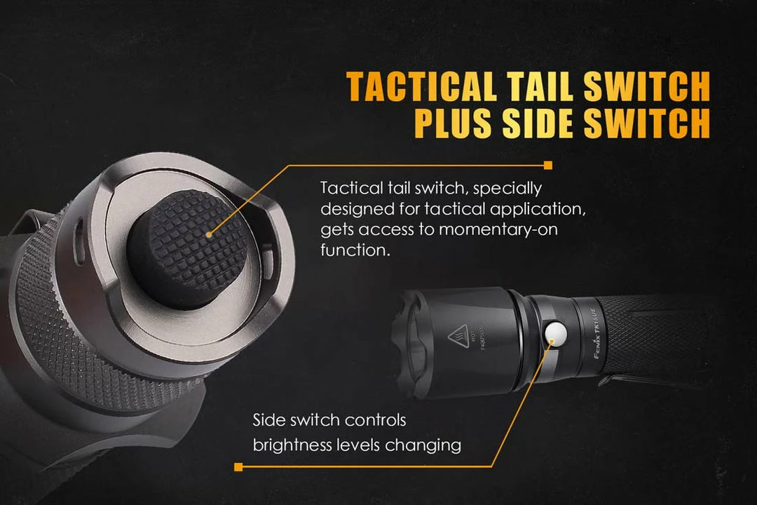 The Fenix TK15UE defines extreme ruggedness. This light employs the new CREE XP-L HI V3 LED technology, which allows the light to throw an impressive beam distance of over 1000 feet (325 meters) and deliver a maximum output of 1000 lumens. With an impact resistant strike face bezel, the TK15UE is ready for heavy duty action. Complete with a tactical tail switch with momentary capability and a side switch to access four brightness levels and strobe, this tactical light is built to assist law enforcement, search and rescue, military and more.