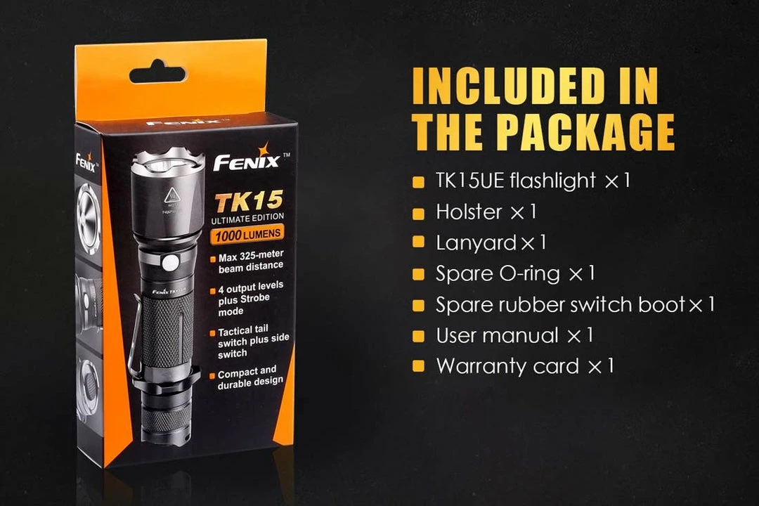 - Fenix TK15UE Flashlight,Lanyard, Holster, Spare O-ring, Spare rubber boot switch.