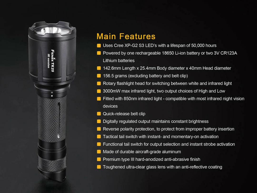 It is fitted with a CREE XP-G2 S3 white LED and 850nm infrared LED. The white light delivers a max output of 1000 lumens and a beam distance of 738.2 feet/225 meters, and the infrared delivers a max of 3000mW. The light is powered by one 18650 Li-ion battery, but is also compatible with cold-resistant CR123A batteries. The two tail switches are for output selection and strobe activation. This Fenix TK25IR version of the TK25 will be indispensable for hunting and most tactical demands.