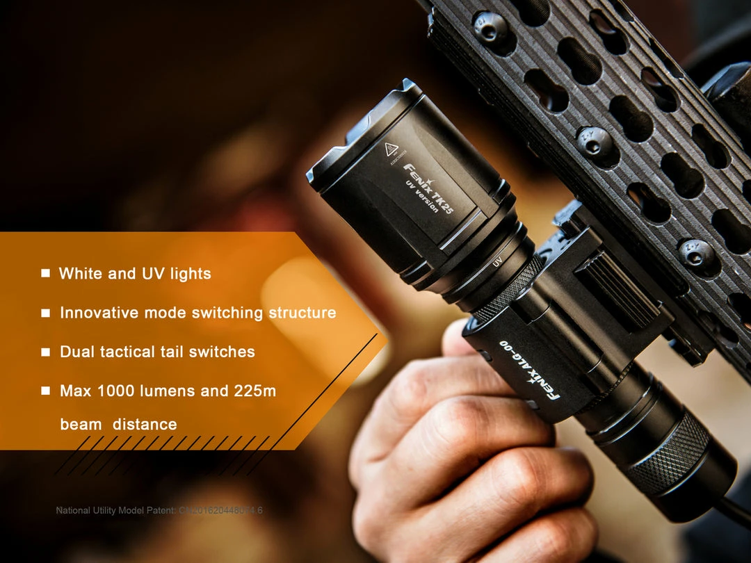 The Fenix TK25UV is a powerful Law Enforcement (LEO) flashlight with a max of 1000 lumens of white light and 3000 mW of ultraviolet light. It combines an innovative mode switching structure to switch between the the white LED light and the UV light. To change modes, simply turn the head of the TK25UV flashlight in either direction. The ultraviolet light has a multitude of uses, most importantly in anti-counterfeit authentication. An added feature of the TK25UV light is the dual tactical switch, which makes turning the light on and off effortlessly. Momentary on is activated by tapping the on and off switch. The functional switch which is located directly below the on/off switch allows you to increase the outputs to 15 lumens, 100 lumens, 300 lumens, and 1000 lumens. As is with most Fenix tactical flashlights, the TK25UV light is IP68 rated, submersible underwater for 30 minutes up to 2 meters or 6.5 ft. Other standard features include an easy carry pocket clip and ultra-clear glass lens with anti reflective coating. The Fenix TK25UV is the perfect light for any tactical team or police department.