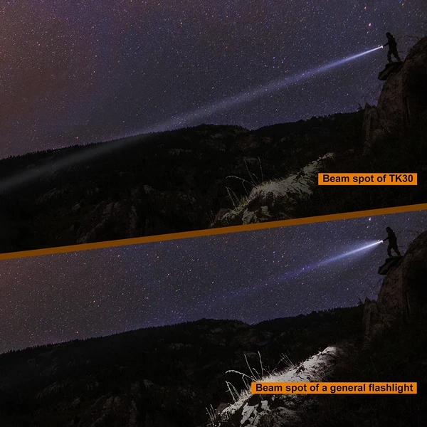 - TK30 Laser Flashlight Size: Length: 6.2” (158mm) x Head: 1.3” (32mm) x Body: 1.0” (26mm)
