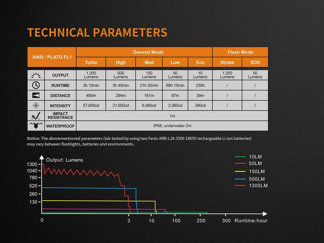 - Batteries: Two 18650 rechargeable Li-ion batteries (not included) NOTE: The light will not work with flat-top 18650s. We recommend any of the ARB-L18 series from Fenix.