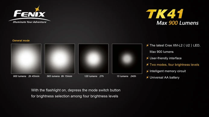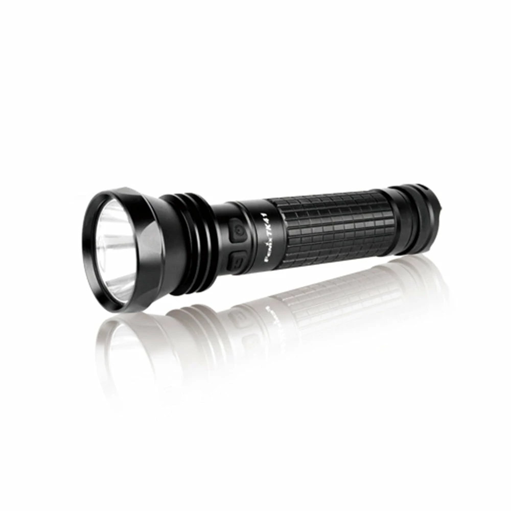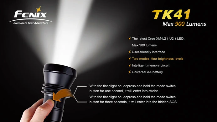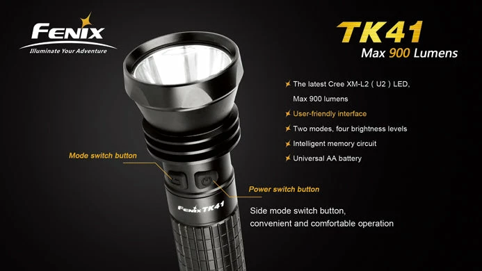 Fenix TK41 is a high-intensity multifunctional flashlight powered by AA batteries. The dual switch system in the side can realize a fast selection among four different brightness levels, strobe and SOS functions. Featuring a max 860 lumens output and the over ten days ultra long runtime, the light can meet your illuminating needs unconditionally. In the meanwhile, the unique design makes TK41 much more compact and lightweight. With the perfect combination of the outstanding performance and the enjoyment of using it, TK41 is the dependable partner when outdoor searching, caving or using as a spare light for automobiles, etc.