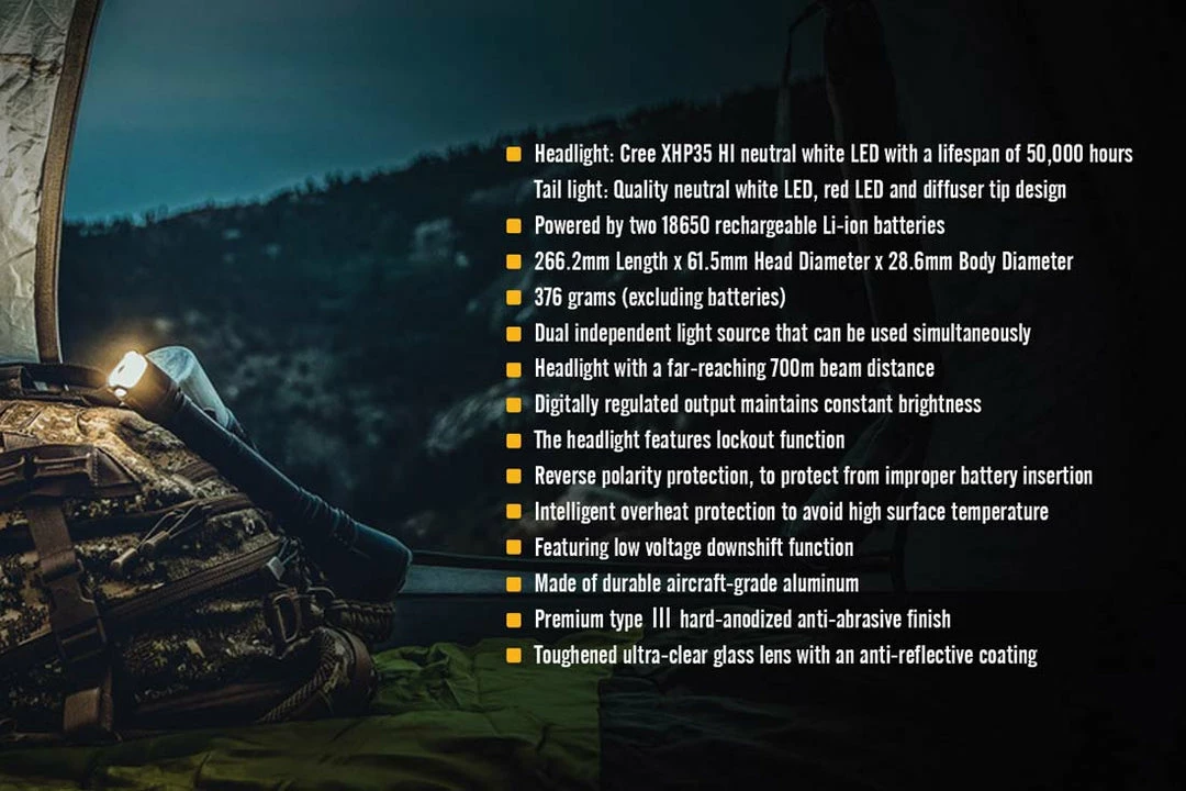 - Headlight: Cree XHp35 HI neutral white LED with a lifespan of 50,000 hours