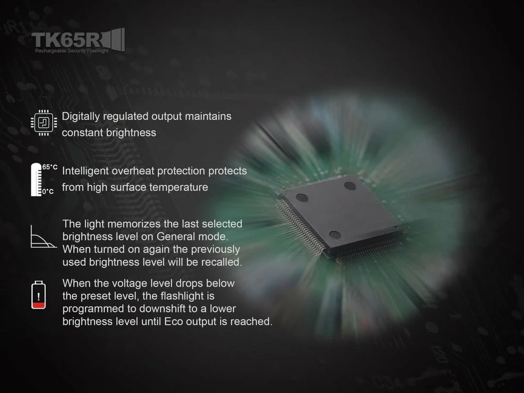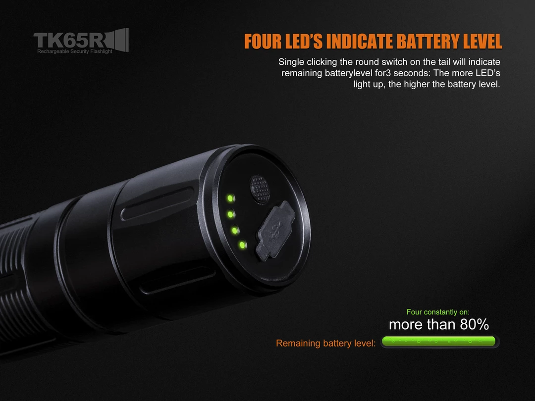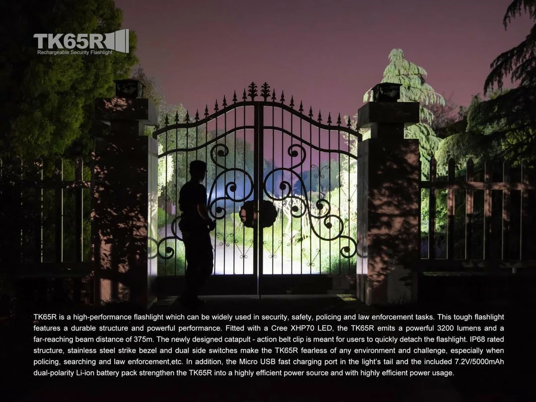 The Fenix TK65R rechargeable security flashlight can be used as a tough duty flashlight in security, safety, law enforcement, rescue and border patrol field. This light features a durable structure and powerful performance. Equipped with a Cree XHP70 LED, the max 3200 lumens output will keep you ready when it is needed for the duty challenges. The IP68 rated structure, stainless steel strike bezel and dual side switches make the TK65R fearless of any environment and challenge, especially for searching, rescuing and law enforcement environments, etc. In addition, the Micro USB fast charging port design and the included 7.2V/5000mAh dual-polarity Li-ion battery pack keep it working with longer runtime.