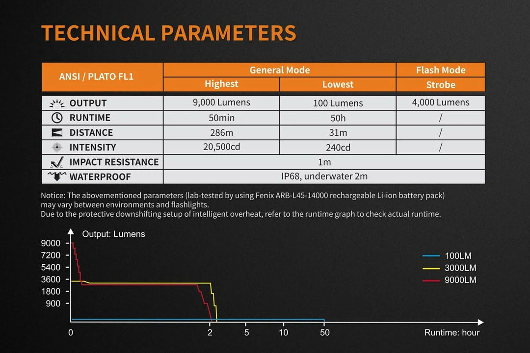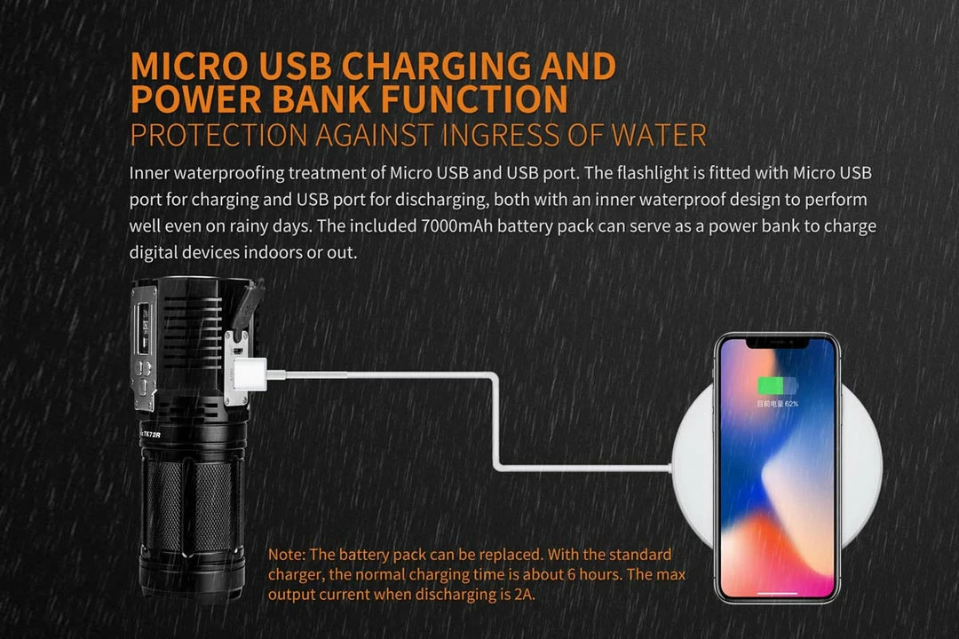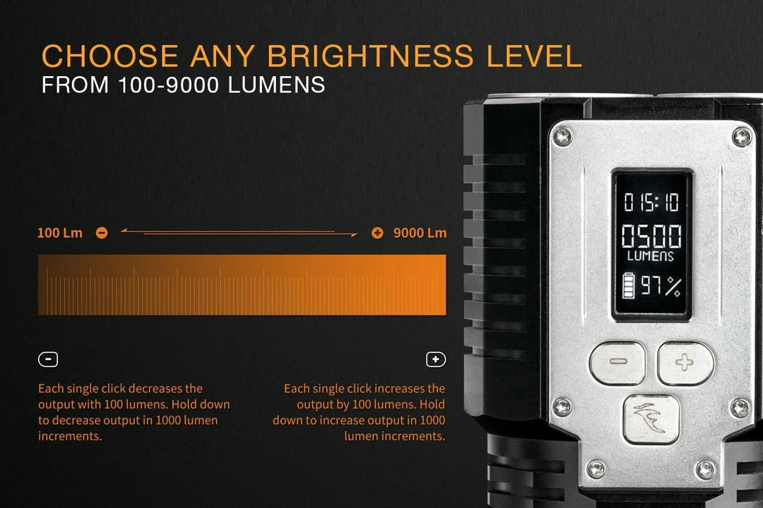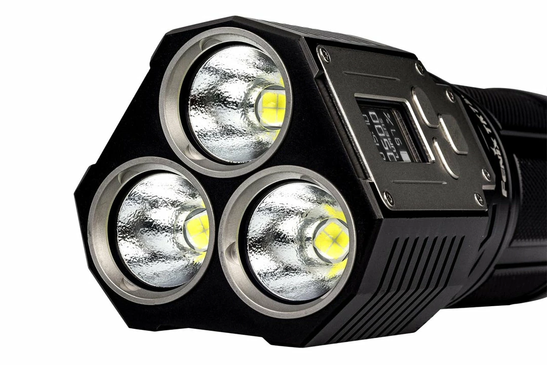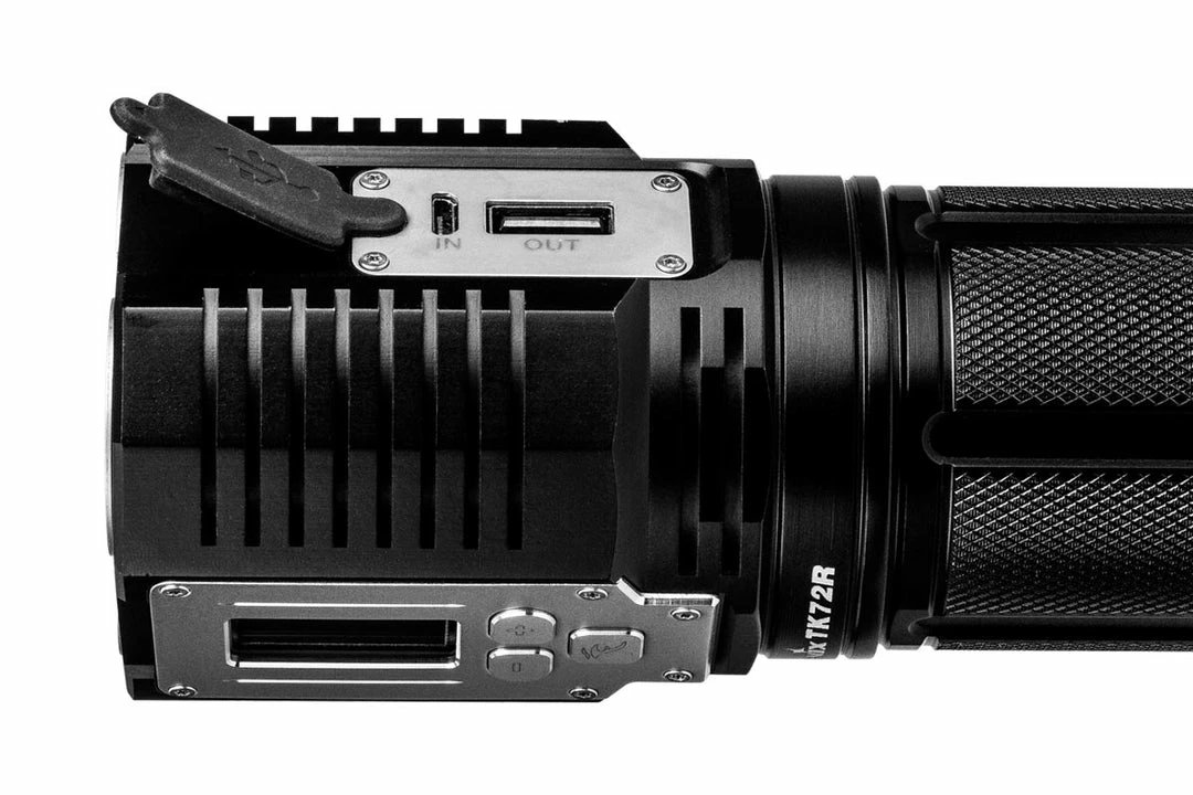 The TK72R Rechargeable Flashlight is Fenix’s most powerful flashlight to date; throwing a light beam over 300 yards with a maximum light output of a blinding 9000 lumens! Operation is made easy by its three stainless steel button interface. Choose from any brightness level from 100 to 9000 lumens (increments of 100) by simply pressing the PLUS or MINUS buttons. The OLED display shows the flashlight’s current status, including brightness level in lumens, available runtime and remaining battery level. The included battery pack is micro-USB rechargeable and can also be used as a power bank to charge other devices. Waterproof and dust proof, this flashlight is comfortable in rough spots where extreme light and versatility are at the forefront.