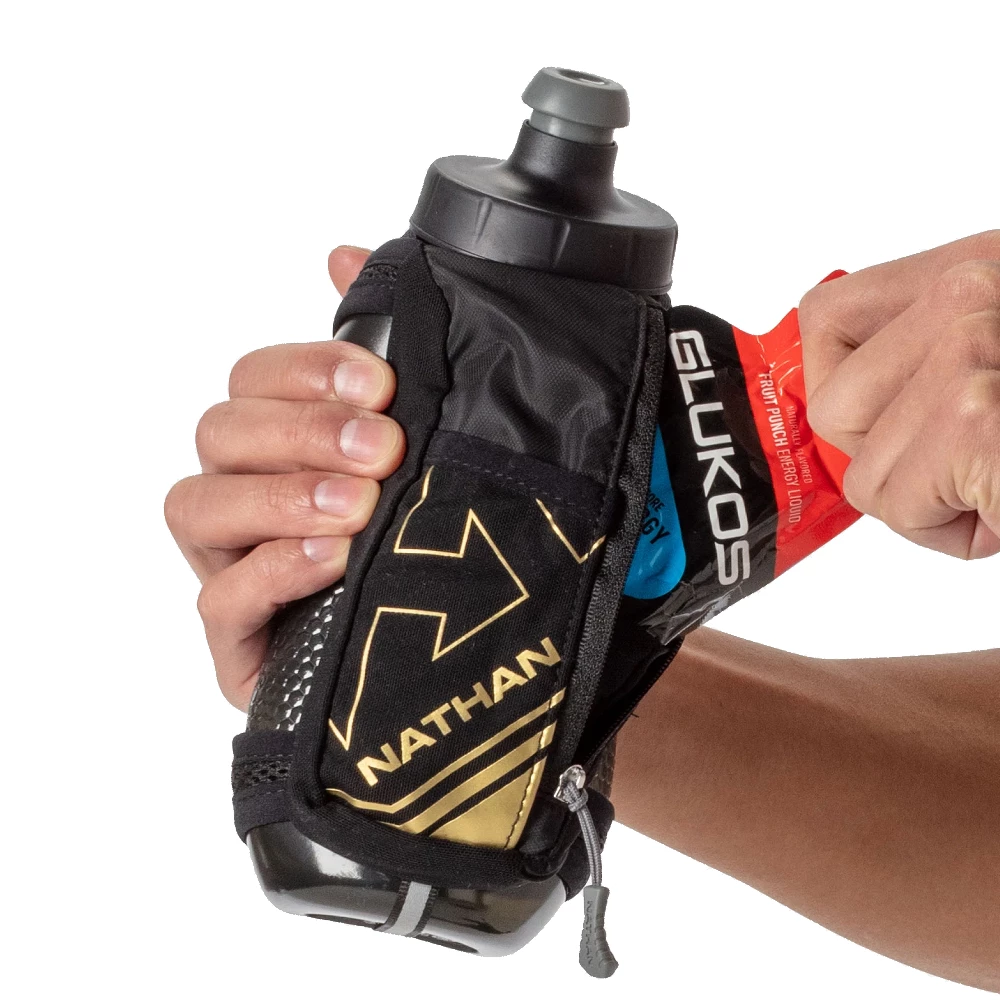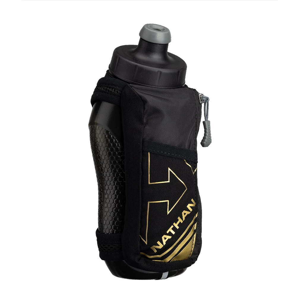 The perfect training partner for any longer runs, the 22 oz. Speedmax Plus Flask is lightweight, ergonomic and offers the most storage with internal and external pockets. Add ice easily with the large cap opening and enjoy a high-volume flow with the Push-Pull Blast Valve™ cap. With the fully adjustable hand strap with chafe-free thumb hole, you can stay focused on the trail ahead rather where your belongings are.