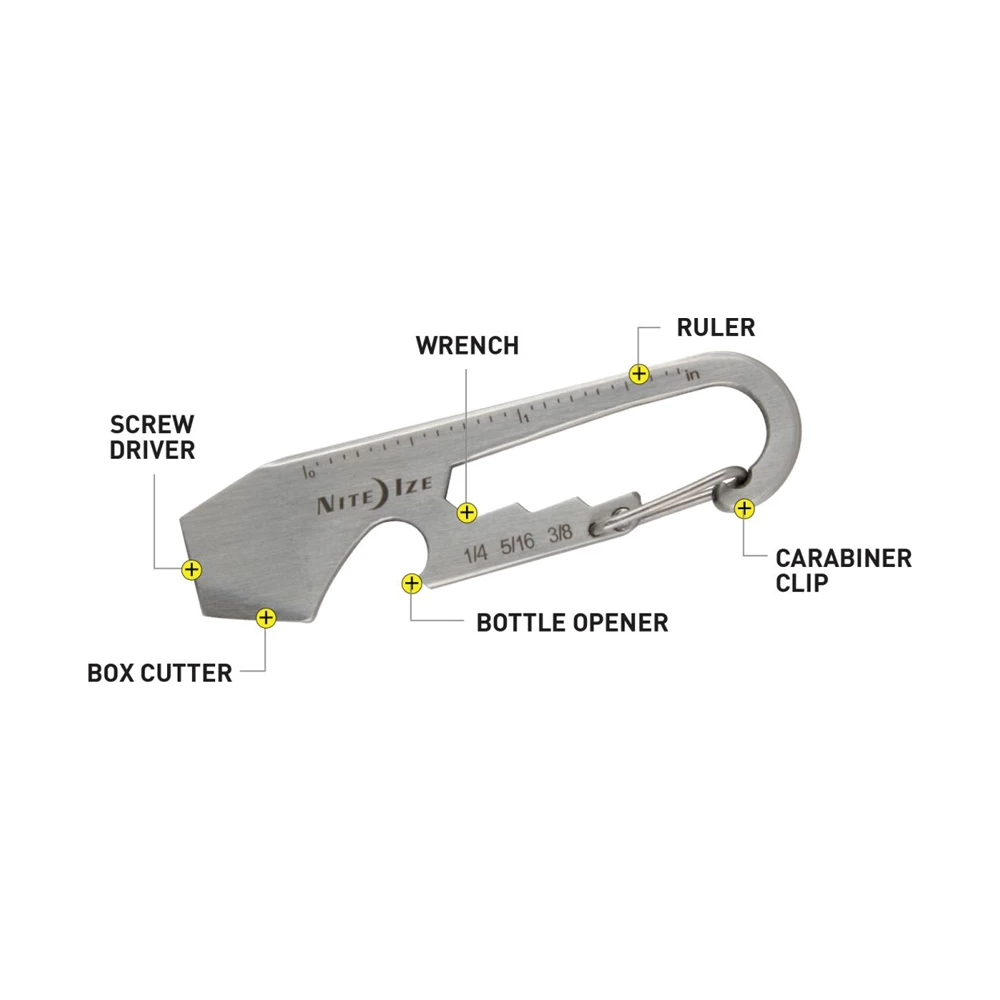 With its lightweight, compact size and multiple save-the-day features, the DoohicKey is something you don’t want to-and don’t have to-ever be without. Made of durable stainless steel, the Nite Ize DoohicKey features a half-dozen tools that do everything from tighten bolts and screws to open a bottle of refreshment, all in a simple key tool that fits in the palm of your hand. On one end of the DoohicKey is a sturdy carabiner clip, allowing you to attach keys to it, or attach the DoohicKey itself to any loop or ring. Opposite the clip is an etched ruler for on-the-spot measurements, and the carabiner opening is strategically shaped to function as a wrench. On the other end, the DoohicKey features a bottle opener, a flat head screwdriver, and a box cutter. With a streamlined, clever design that makes it easy to carry, attach, remove, and reattach, it’s always as at-hand as it is handy.