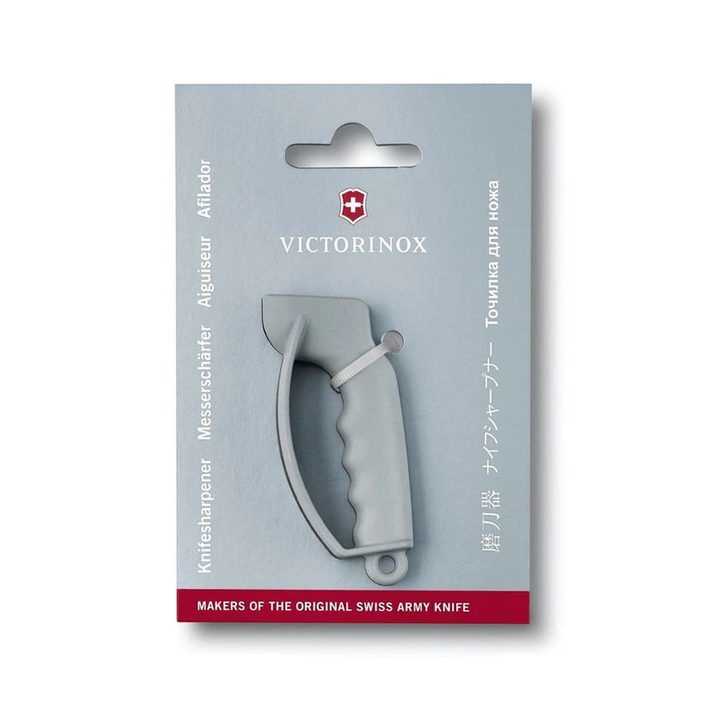 Quickly, easily and safely sharpen every straight- and wavy-edged knife in your drawer to its precision-cutting best with our small Knife Sharpener/Victorinox Sharpy, which has been ergonomically designed for the safest possible handling. This piece’s sharpening mechanism consists of small V-shaped plates formed of carbide metal, which have been placed at an optimal angle inside the design’s outer structure. Because these can be turned during the course of the sharpener’s life, it can be relied upon to give its users years of service.