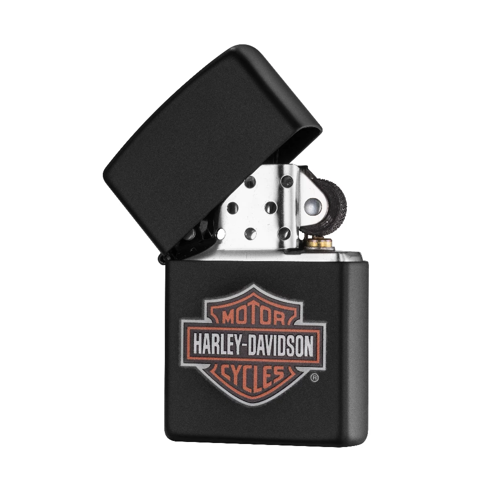 The lighter features the Harley-Davidson® bar and shield logo color imaged onto a black matte lighter. Comes packaged in a gift box. For optimal performance, fill with Zippo lighter fluid.