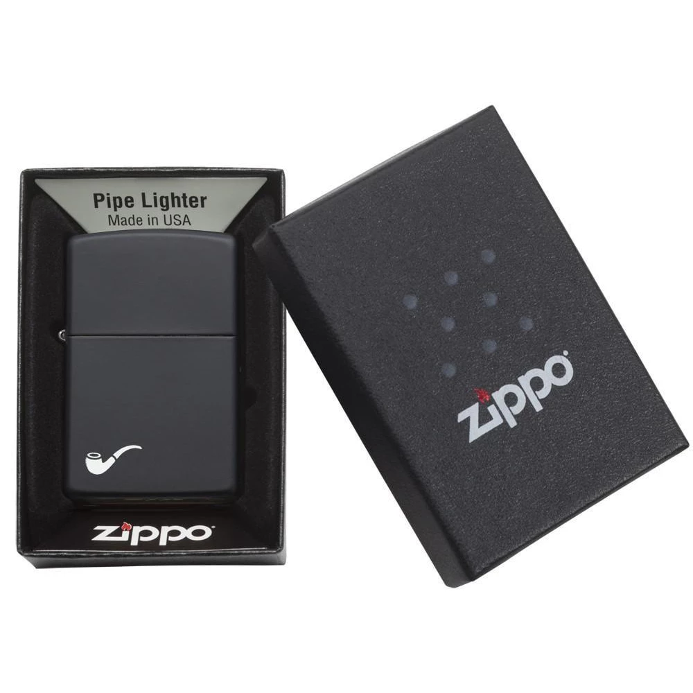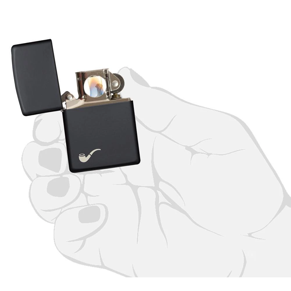 This black matte pipe lighter was designed for the special needs of pipe smokers. The insert makes this lighter unique as the design encases the flame in metal, allowing it to be drawn directly into the pipe without bending over the side and damaging the bowl. The result: perfectly lit tobacco, with no damage to the pipe. Comes packaged in a gift box. For optimal performance, fill with Zippo lighter fluid.